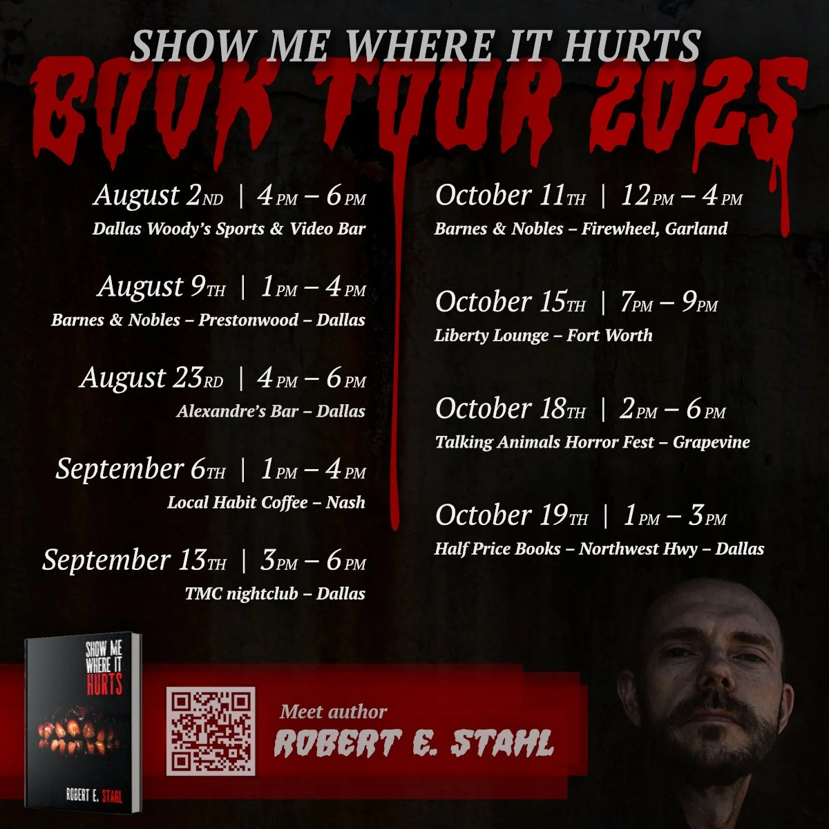 Meet Dallas horror author of Show Me Where It Hurts, Robert E. Stahl, on the road, coming to a location in Texas near you.